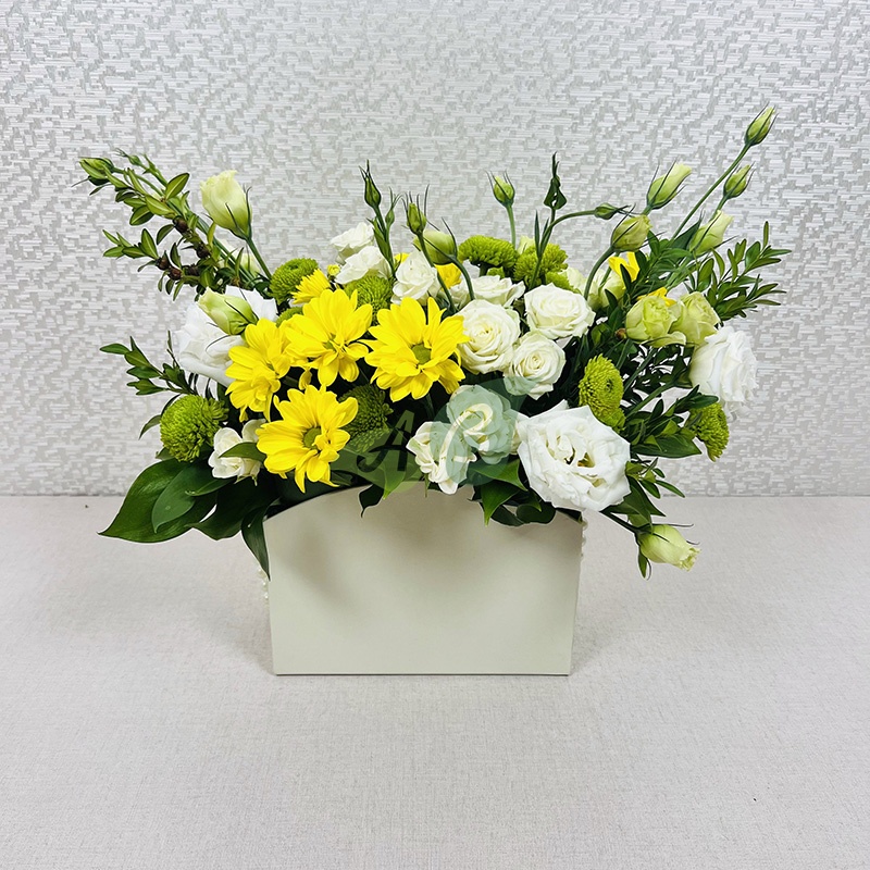 Облако кустовых роз и желтые хризантемы в коробке – такую прелесть можно заказать с доставкой в любой район Сорочинска.